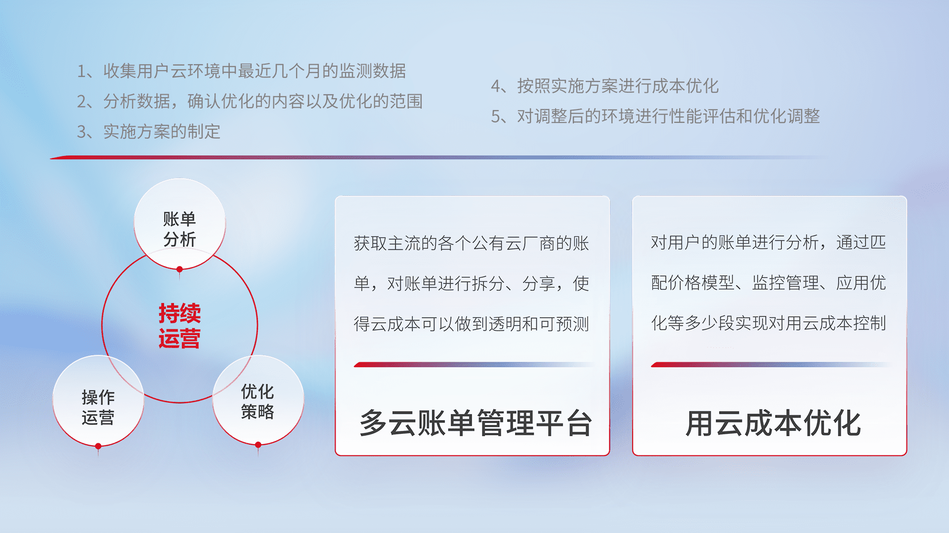 通过多云纳管,,,,以统一的资源数据模型把客户的云资源进行抽象和封装,,,进而实现对多云资源的统一操作,,,,保障云资源管理的可靠性、、、稳定性与可用性。。。量身定制化运维内容,,,配置、、开发运维、、、、补丁管理、、、、备份、、、监控、、认证和访问管理、、审计和日常巡检等,,,,保障在用云过程中的可靠度,,,稳定度以及高可用率。。